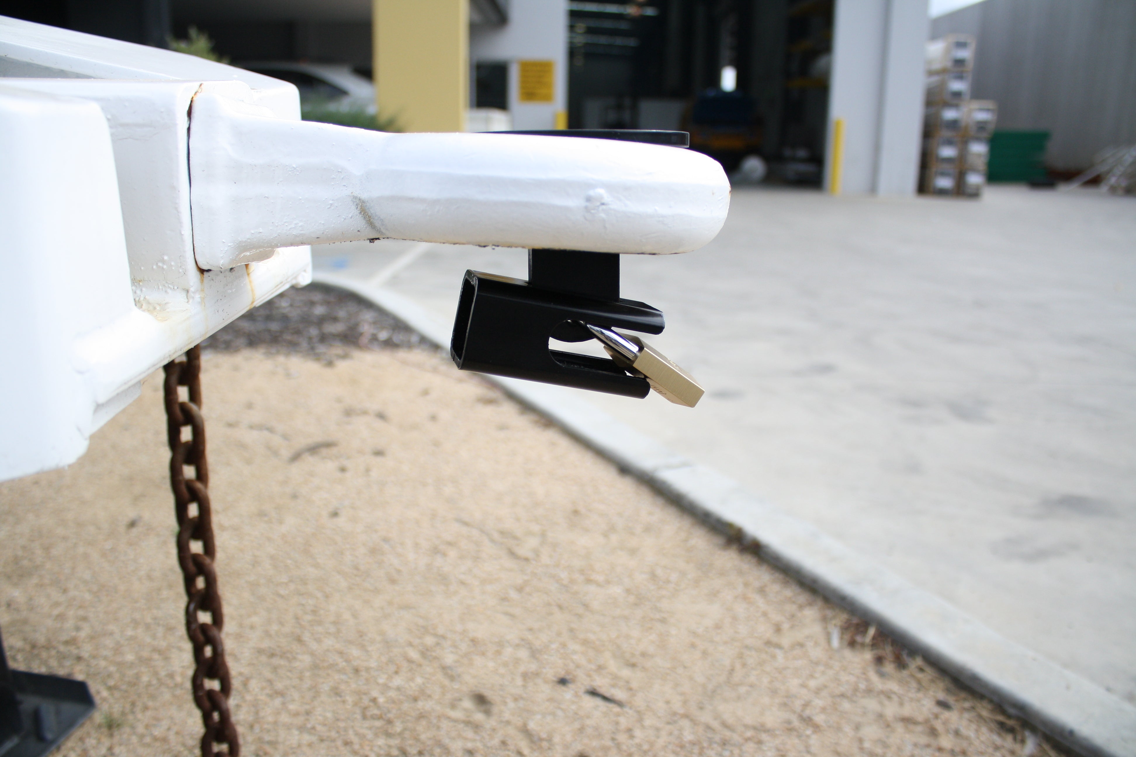 Theft prevention device that secures the pintle hook to the towbar. It consists of a steel locking bar and a padlock that fit over the pintle hook adaptor.